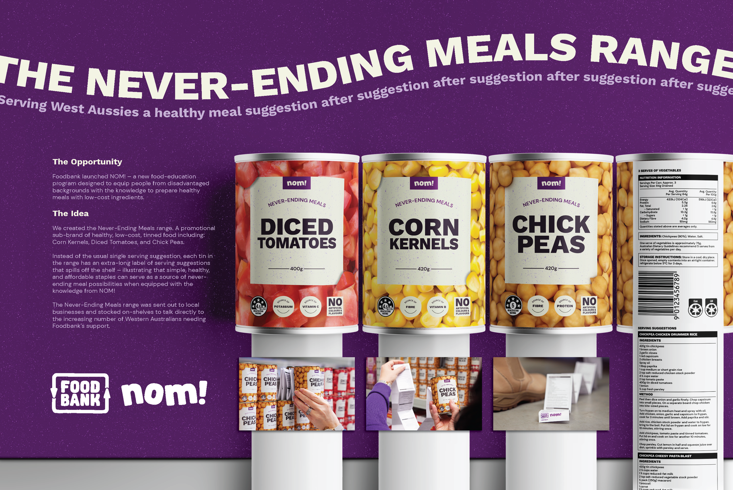 We sent out staple ingredients with an extra long serving suggestion label. Illustrating all the different ways a healthy, low-cost ingredient can be used.